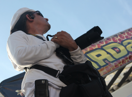 | El oficial Rolando Calzadilla, de Bird and Bee Removal nos permitió gentilmente trepar la escala de su camión estratégicamente ubicado en la Calle 8 y la 27 Avenida, desde donde logramos una espléndida panorámica fotográfica de la marcha (es la segunda foto de este reportaje; volver arriba) |
