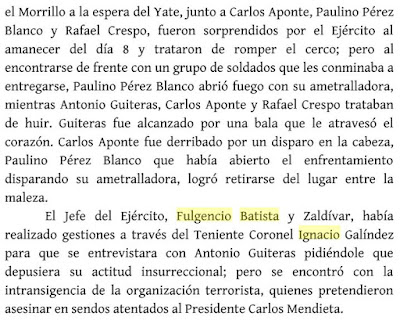 A continuación fragmentos del libro Batista, el ídolo del pueblo, cuyo autor es Alejandro Prieto Blanco. Hago el importante señalamiento que tanto en este libro como en el libro Fulgencio Batista: The Making of a Dictator, se narra de manera coincidentes en su esencia la entrevista del Teniente Coronel Ignacio Galíndez (quién era amigo de Guiteras y había pertenecido a La Joven Cuba) con Antonio Guiteras en lo relativo a la proposición de Batista a Guiteras para que abandonara la lucha de secuestros, robos y atentados, así como en el conocimiento, (sin darle detalles para cuidar la fuente de la información) que tenía el gobierno de su intención de escapar de Cuba.
