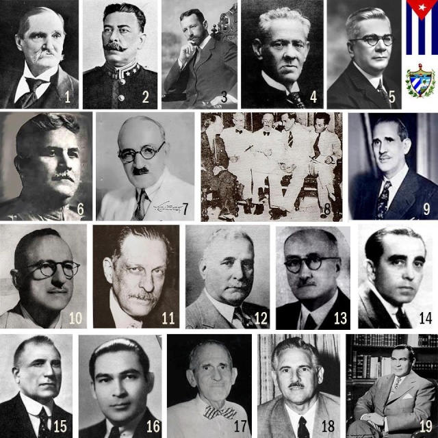 (Presidentes y gobiernos de Cuba: Don Tomás Estrada Palma, José Miguel Gómez, Mario García - Menocal y Deop, Alfredo Zayas, Gerardo Machado y Morales, Alberto Herrera, Carlos Manuel de Céspedes y Quesada, La Pentarquía, Ramón Grau San Martín, Carlos Hevia, Manuel Márquez Sterling, Carlos Mendieta y Montefur, José A. Barnet y Vinajeras, Miguel Mariano Gómez, Federico Laredo Brú, Fulgencio Batista y Zaldivar, Ramón Grau San Martín, Carlos Prío Socarrás y Fulgencio Batista y Zaldivar)